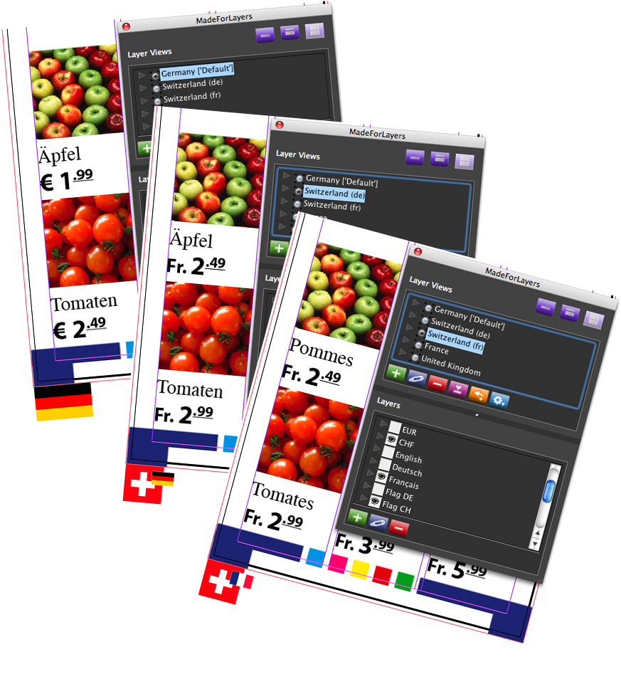 W publikacjach regionalnych, takich jak broszury sprzedażowe, katalogi itp., część treści jest zazwyczaj dostosowywana do potrzeb różnych regionów lub grup docelowych. Tworzenie widoków warstw za pomocą axaio MadeForLayers umożliwia porządkowanie tych różnych wydań regionalnych. Można to zrobić dla istniejących dokumentów lub utworzyć szablon, aby usprawnić edycję wszystkich przyszłych publikacji. W połączeniu z axaio MadeToPrint można łatwo zapisać oddzielne pliki dla każdego wydania regionalnego.